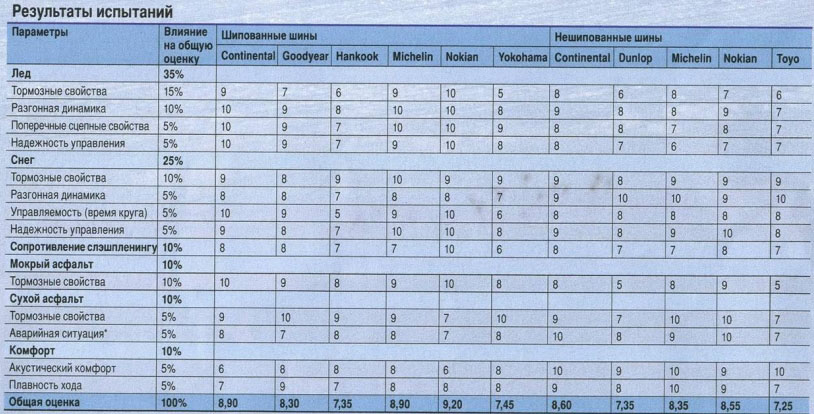 Результаты тестов мы перевели в баллы по 10-балльной шкале, а после суммировали с учётом их весомости. «Во главу угла» мы поставили сцепные качества и управляемость на скользких поверхностях.